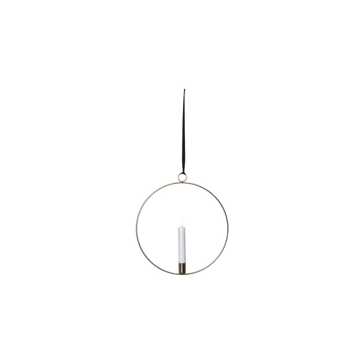 28cm mässingsfärgad metallring med vårt fina antikljus Flamme i 15cm som medföljer . Fin att dekorera med i fönster eller mot en vägg. Undvik att hänga i direkt solljus då vaxljuset kan smälta utav värmen.