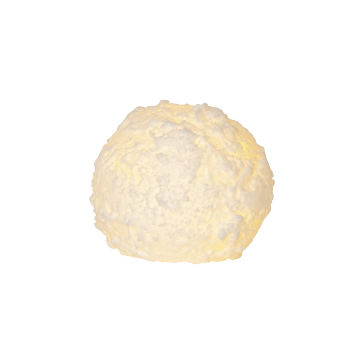 Vaxljus i form av en snöboll som lyser med varmvitt sken. Med inbyggd timer
