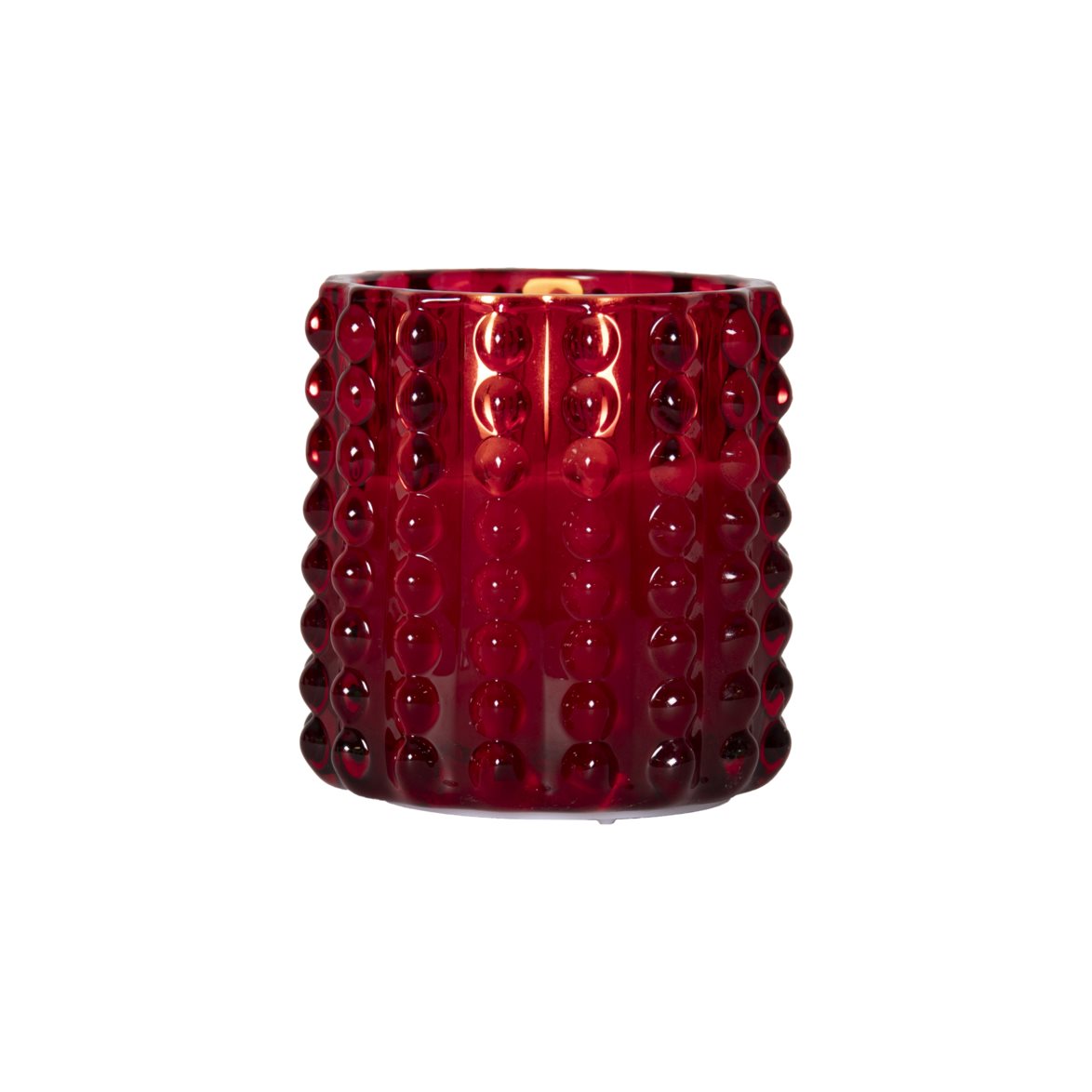 Flamme Dotty glaslykta med batteriljusi rött glas med prickmönster. Ljuset är cirka 9 x 9cm. Detta batteridriljus blir en vacker dekoration, både ensam och i grupp ihop med övriga ljus från vår Flamme serie. Den har timerfunktion och när brytaren är på timerläget lyser ljuset i ca 30 dagar med en vacker realistisk låga i varmvitt. Den drivs av 2 AA batterier, dessa ingår ej.
